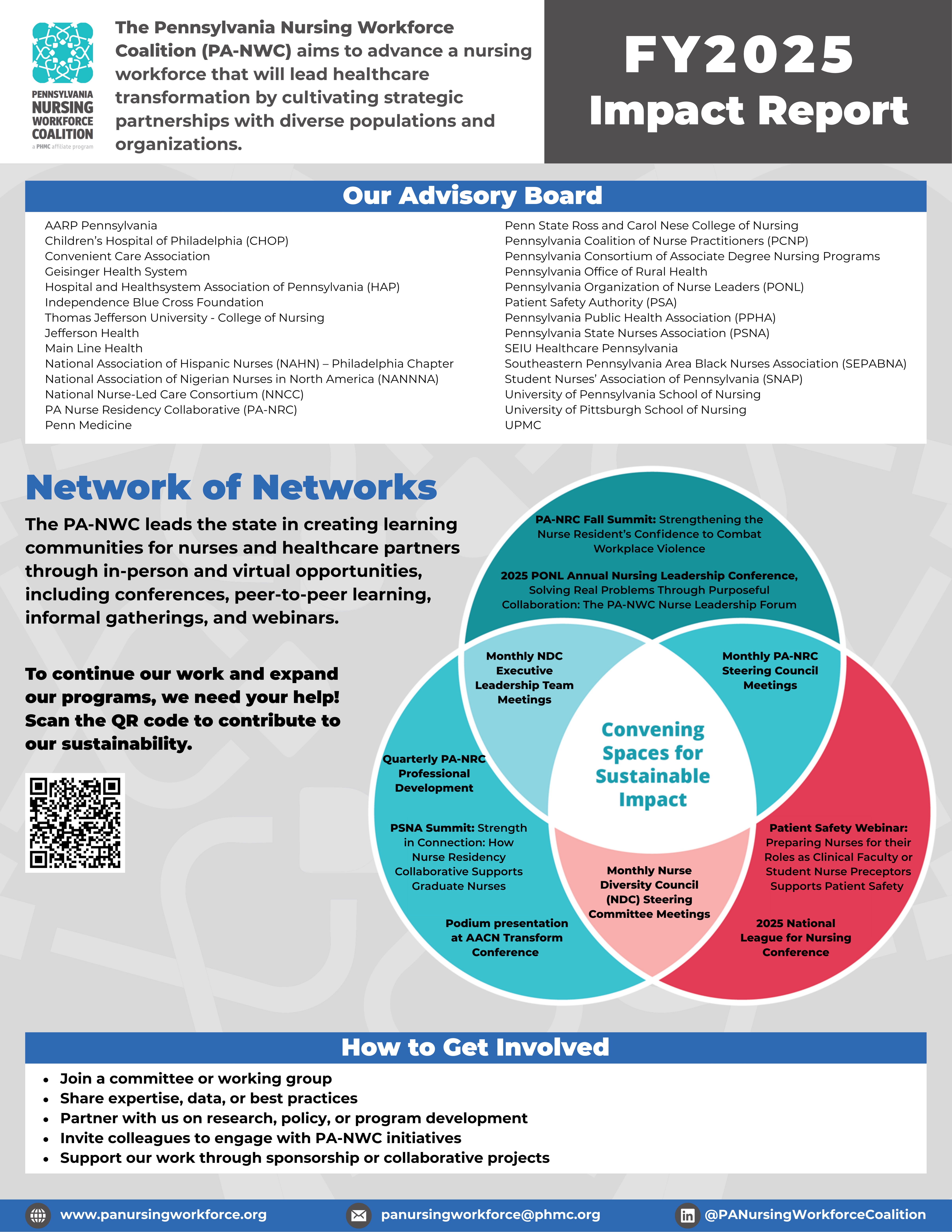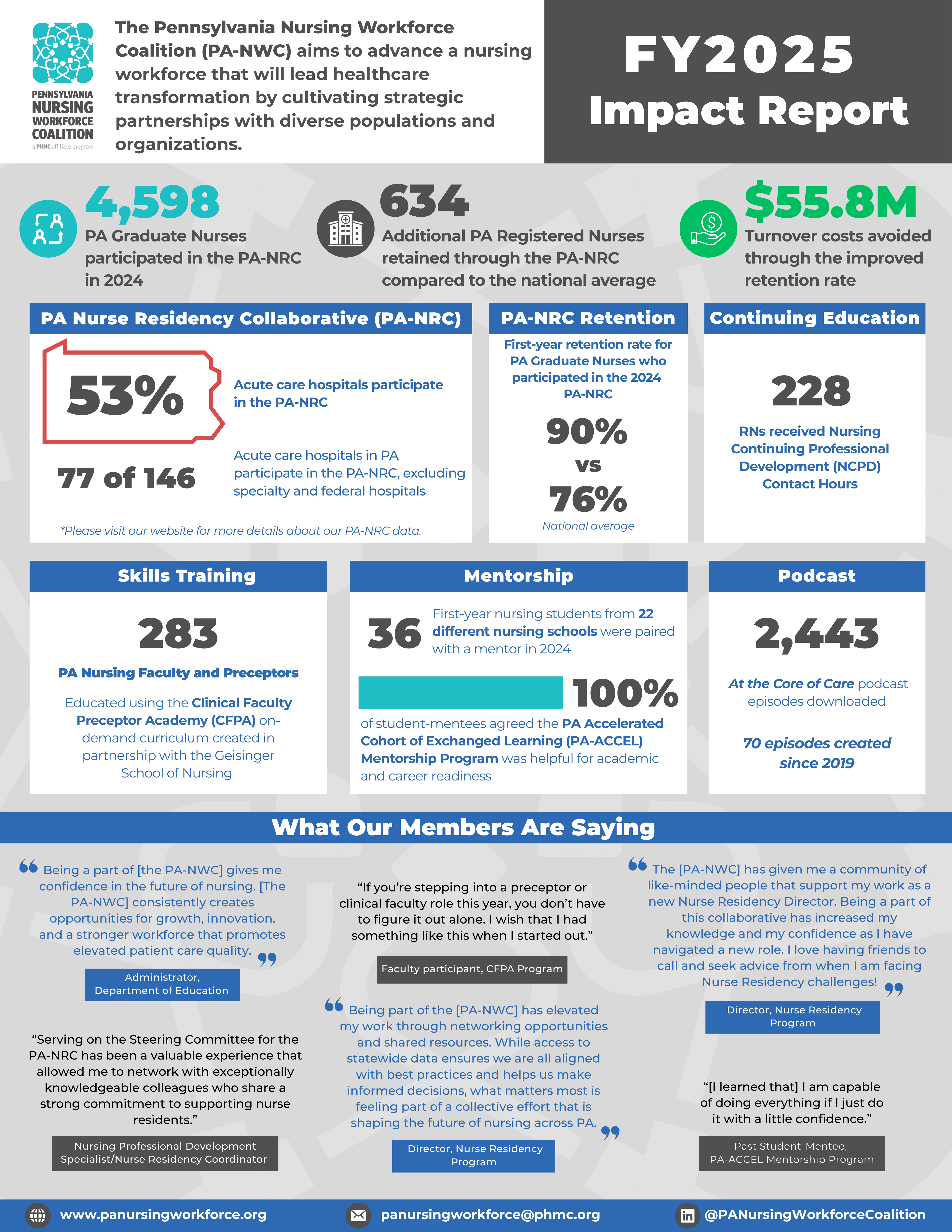 The Pennsylvania Nursing Workforce Coalition (PA-NWC) has been busy this past fiscal year, and we are excited to show the impact of our programs on Pennsylvania's nursing workforce! We are pleased to share with you our first Fiscal Year Impact Report, which can be shared with your networks.
